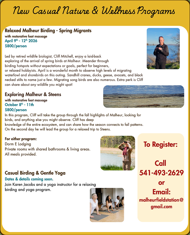 Looking ahead, Malheur Field Station is focused on expanding formal and informal educational opportunities for K-12 and university students, strengthening place-based learning, community engagement, and nature-and-wellness programming. These goals will be supported by strategic facility improvements, including renovations and expanded public lodging, to better serve researchers, students, and visitors into the future.